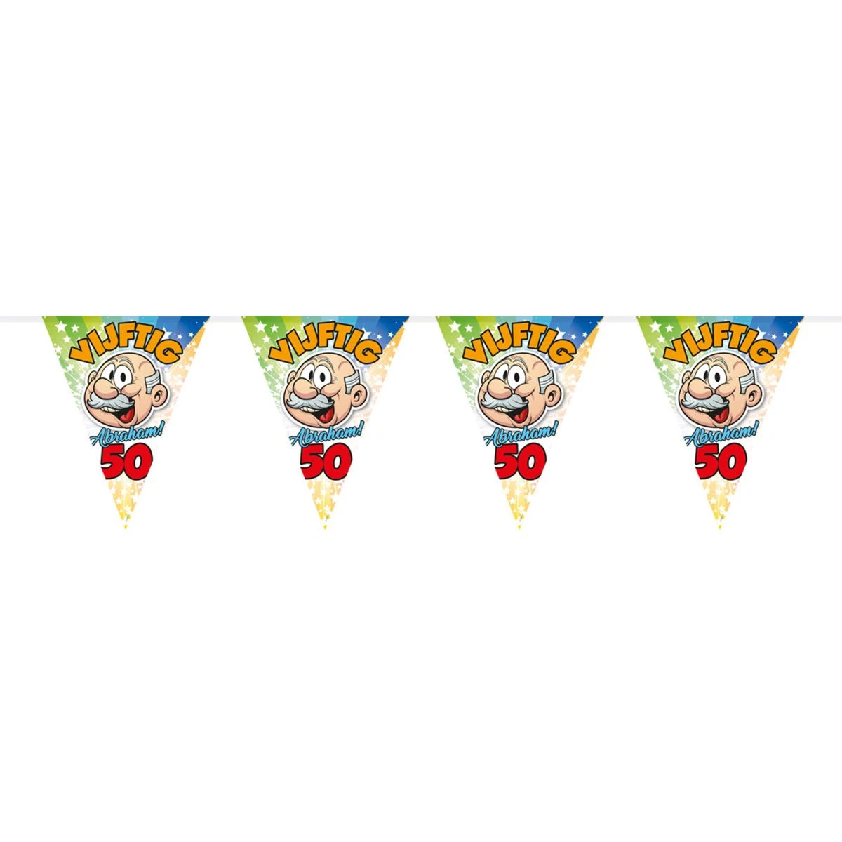 Vrolijke vlaggenlijn met afbeelding van Abraham en opdruk 50 jaar. Met deze vlaggenlijn komt Abraham lekker in het zonnetje te staan! De vlaggenlijn is 10 meter lang.