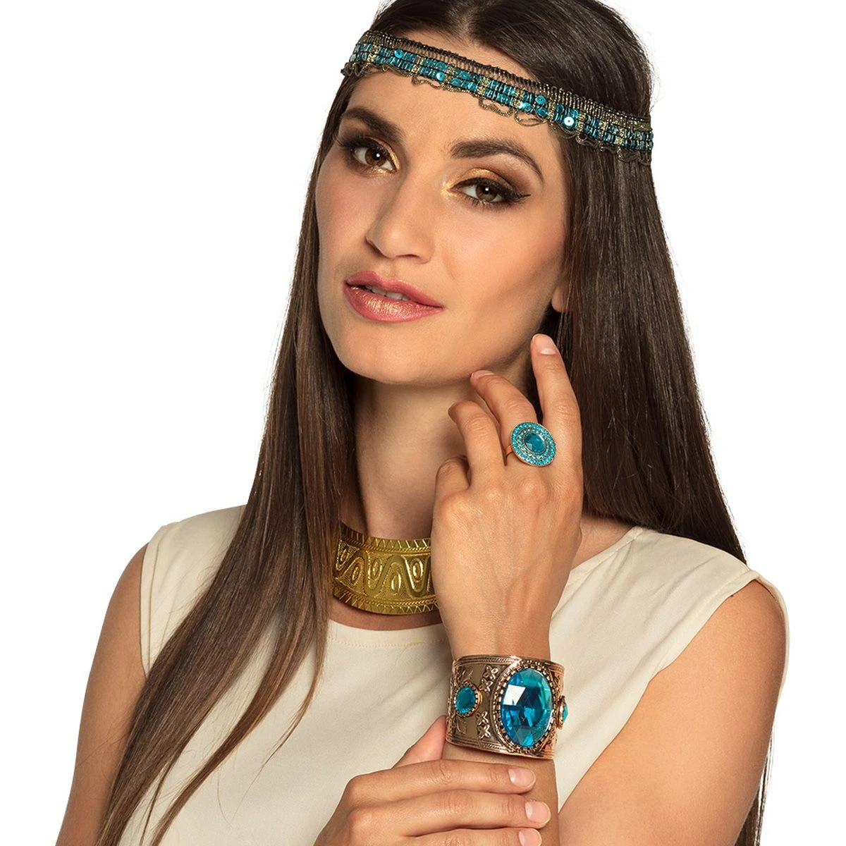 Schitterende gouden armband met grote blauwe stenen. Geschikt voor bijvoorbeeld een epyptische of zigeuner outfit.
