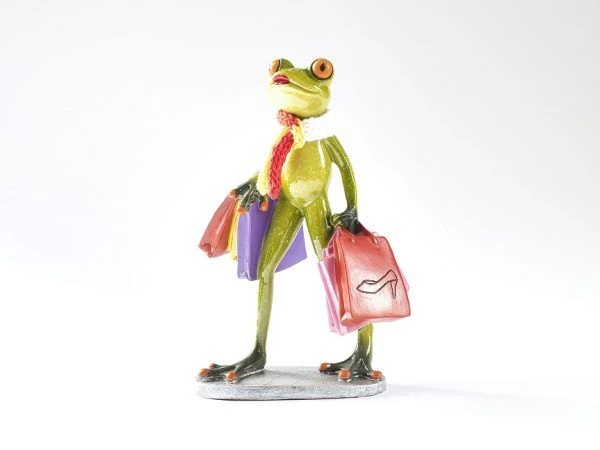 Beeldje van een shoppende Oetel met allerlei tassen. De kikkers zijn gemaakt van kunststeen. Leuk om cadeau te geven of natuurlijk zelf te houden.