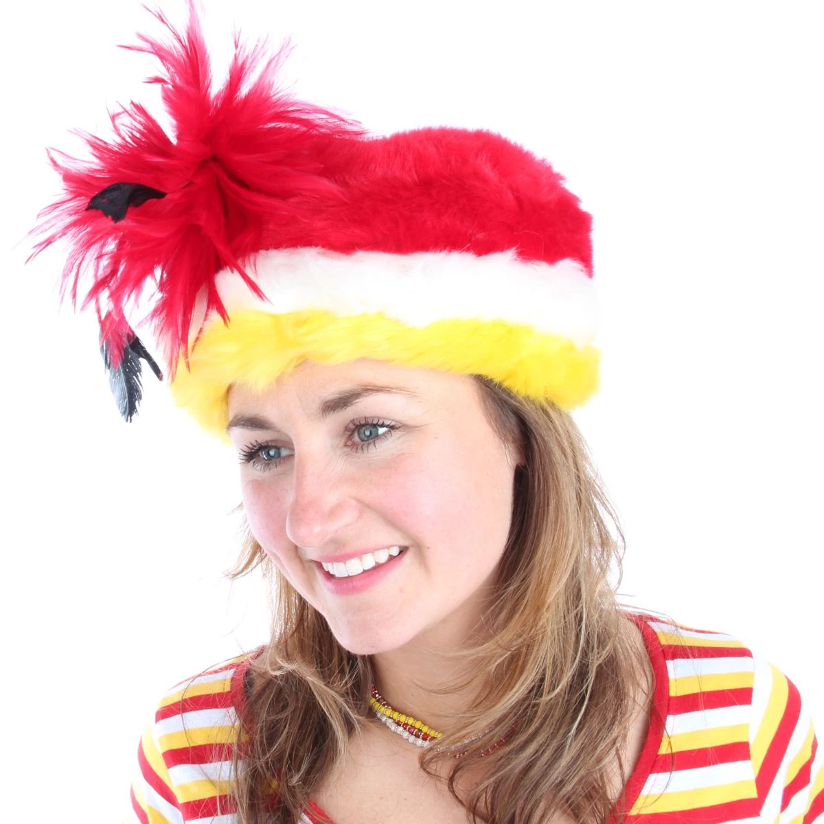 Muts van imitatiebont in Oeteldonkse kleuren, voorzien van veren aan de voorzijde. One size
