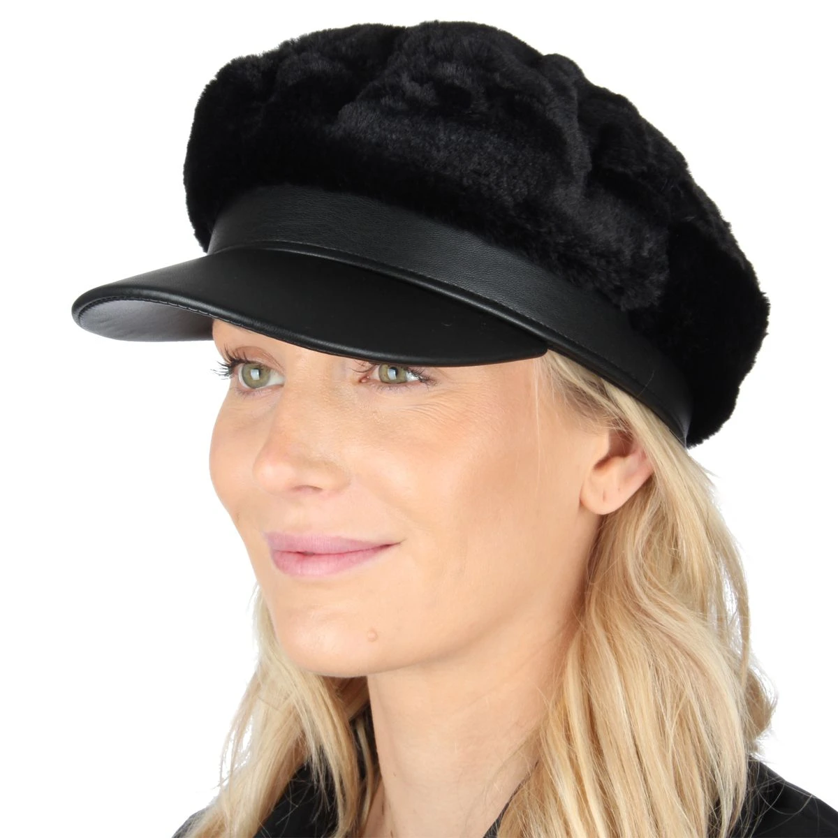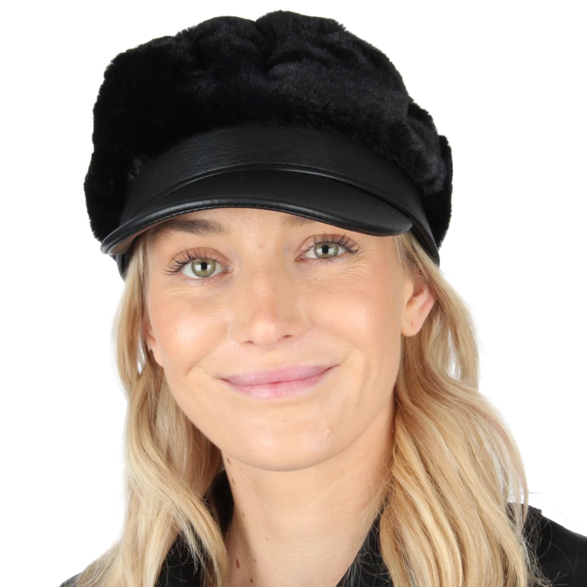 Mooie luxe pet van zwart imitatiebont met zwarte klep. Een stijlvolle pet voor een feest of gewoon lekker bij je winterjas!