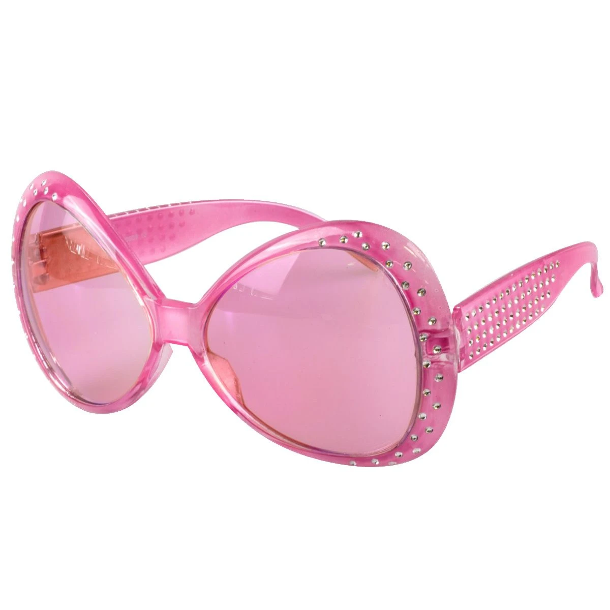 Hippe, grote bril in de kleur roze met kleine strass steentjes. Een superleuke bril voor een sixties/seventies outfit of voor een festival.