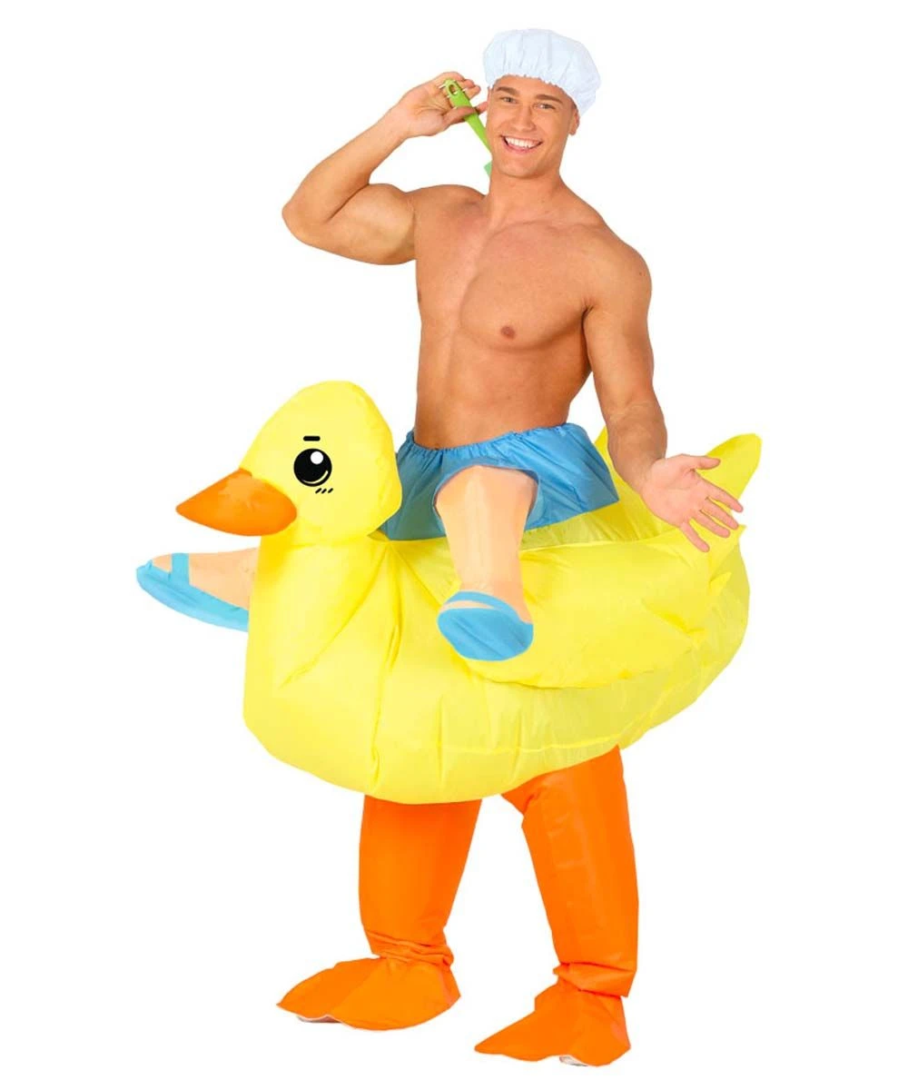 Carry Me eend kostuum. Met dit kostuum lijkt het net alsof je op de rug van een badeend zit.