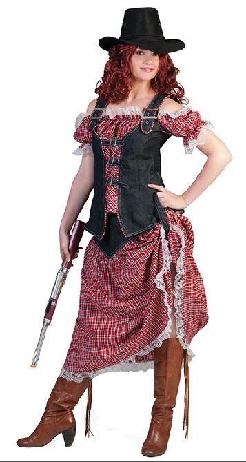 Stoer geblokt off-shoulder cowgirl jurkje met daaraan bevestigd een denim gilet met gespen.