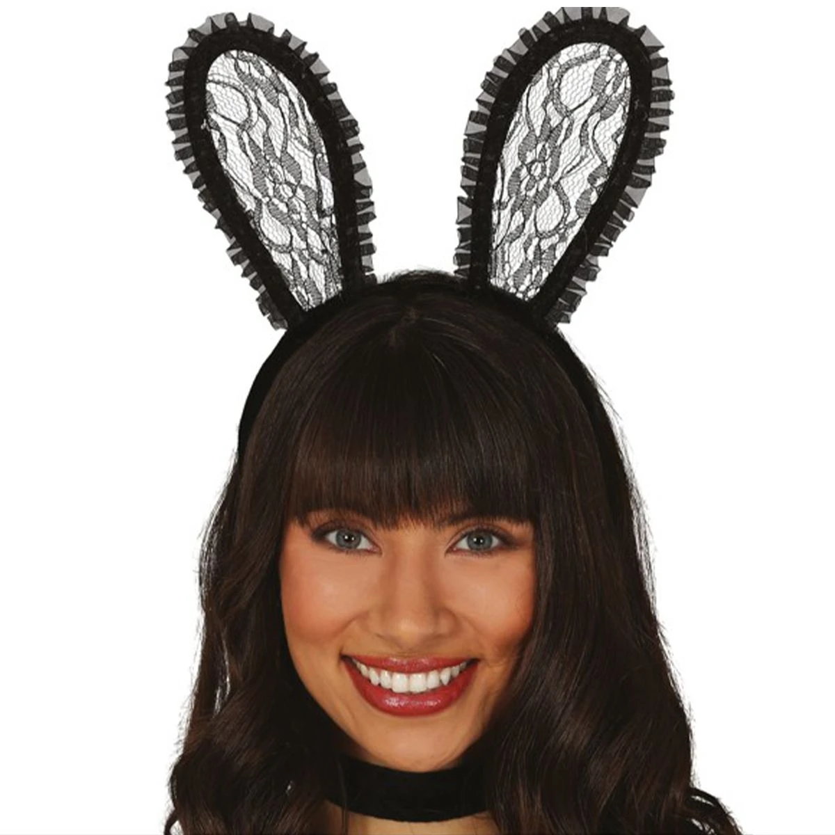 Diadeem met zwarte konijnenoren met een kanten binnenkant.