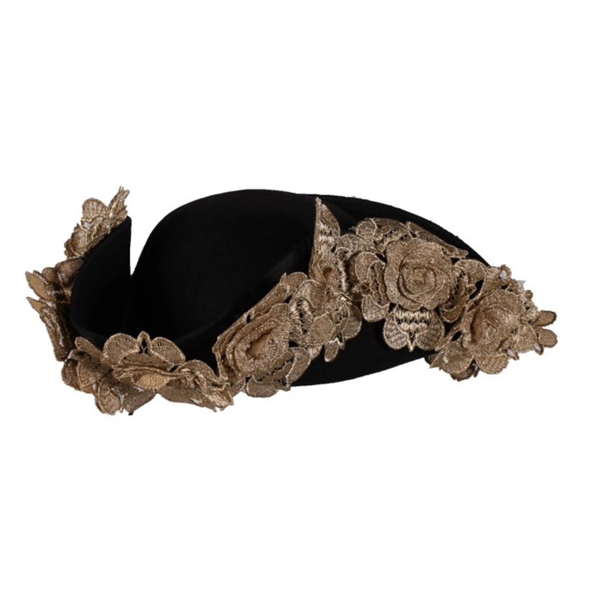 Prachtige zwarte driesteek met gouden brokaat bloemen.