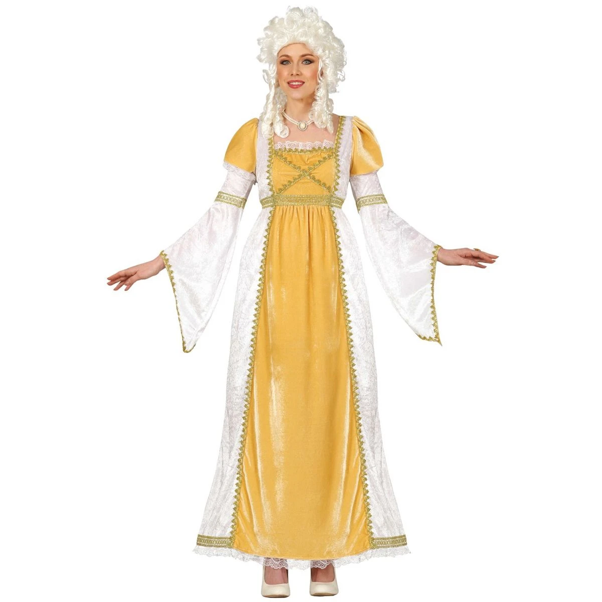 Prachtige gravin jurk met een gele voorkant en een witte achterkant. Met deze jurk zie jij er uit alsof je écht van adel bent. Maak de look af met een van onze pruiken!
