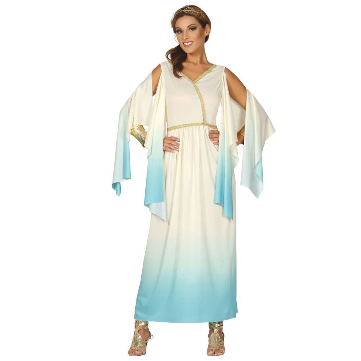 Dit Griekse dames kostuum bestaat uit een lange wit met blauwe jurk met gouden accenten.