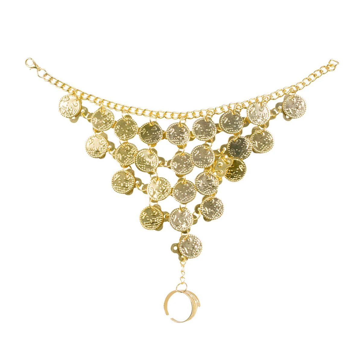 Schitterende gouden handketting met muntjes. Een heel mooi accessoire voor een zigeuner- of oosterse outfit zoals een buikdanseres.