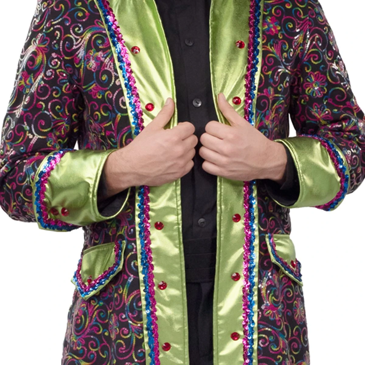 Deze lange herenjas is gemaakt van taft en helemaal bezet met gekleurde pailletjes en diamantvormige knopen. Een bijpassend damesmodel is beschikbaar om samen op chique te gaan!