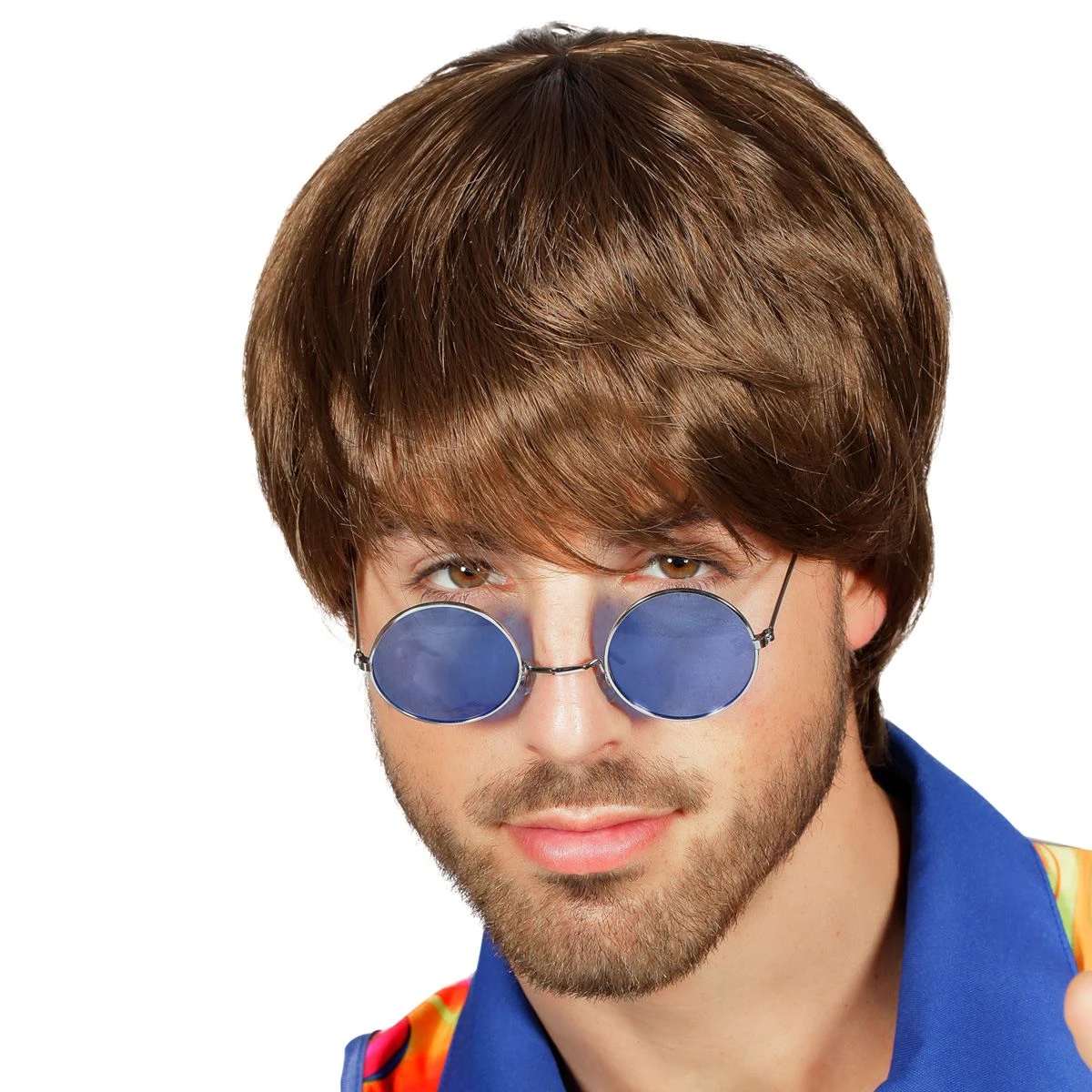 Korte, strakke, bruine herenpruik in seventies stijl.