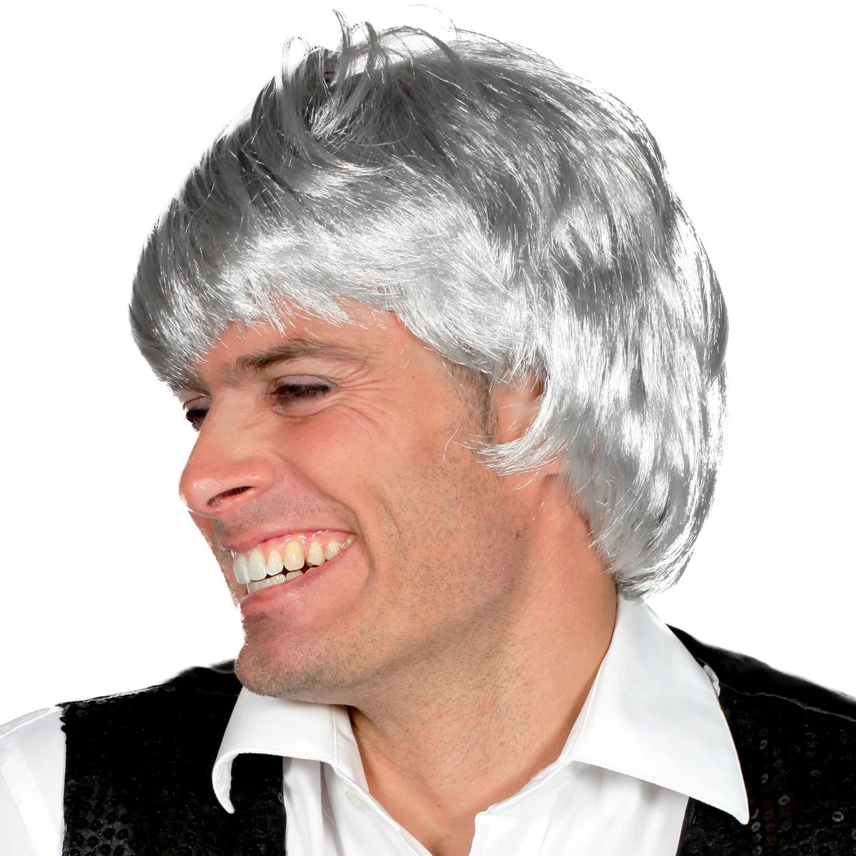 Korte, strakke, grijze herenpruik in seventies stijl.