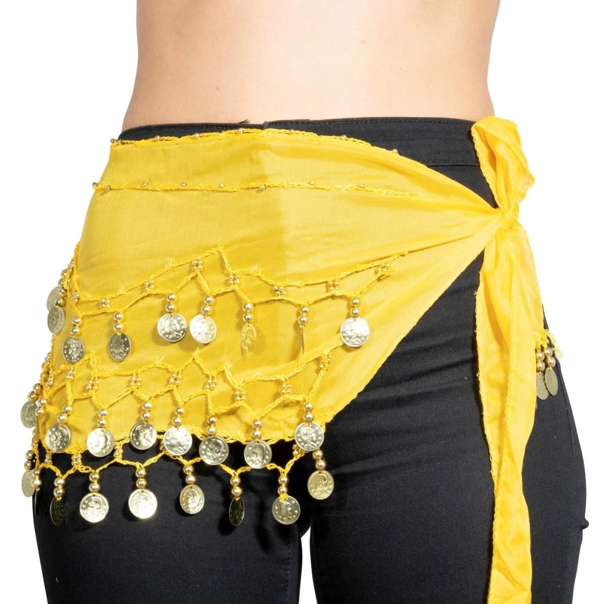 Mooie belly dance heupsjaal in geel met gouden muntjes. Deze heupsjaal voegt nét dat beetje extra feestelijkheid toe aan jouw outfit!
