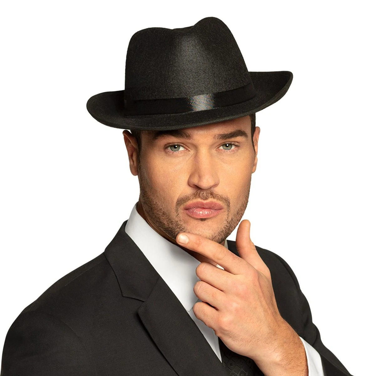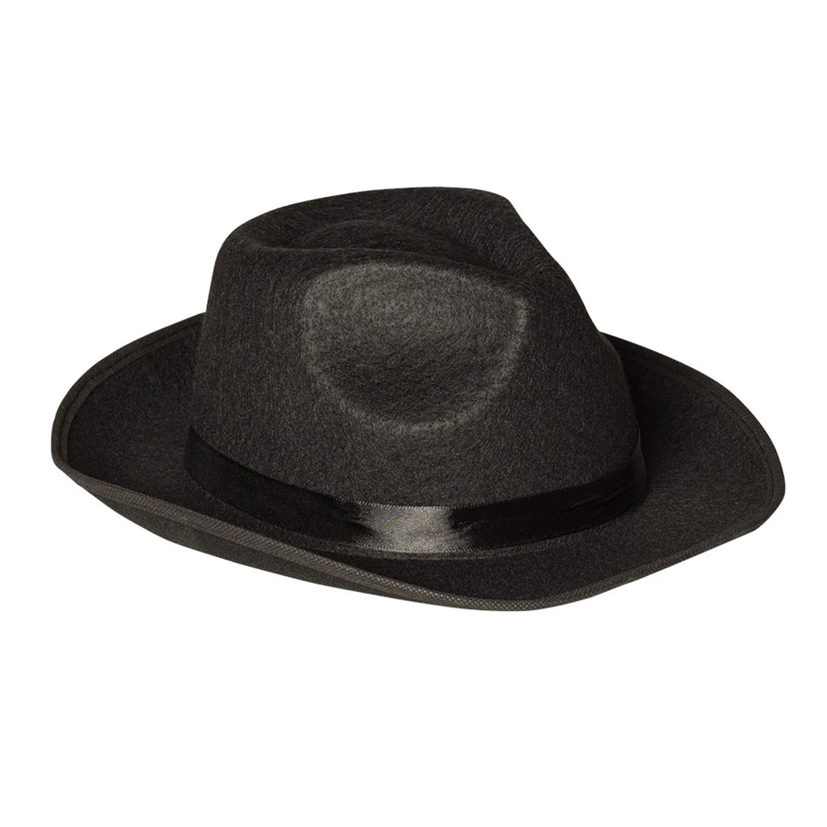 Zwarte gleufhoed met band, geschikt voor bijvoorbeeld een maffia outfit. Onze size.