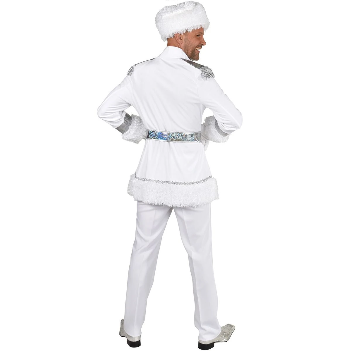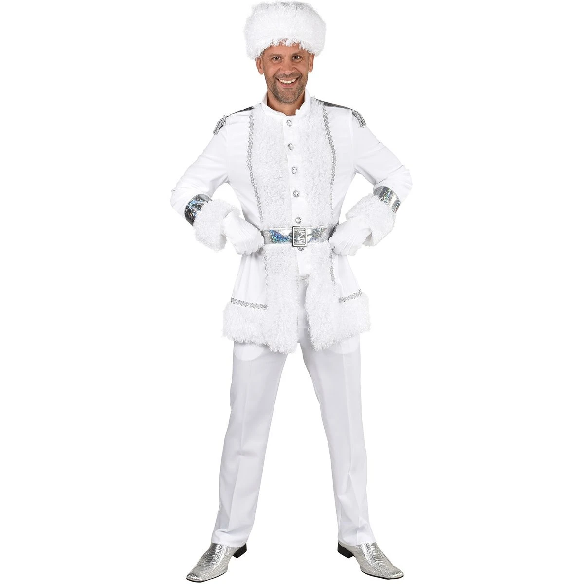Super mooie witte ijsmantel voor heren. De mantel is afgewerkt met glinsterend zilveren accenten en epauletten. Combineer de mantel met een witte broek en een bontmuts om je look compleet te maken!