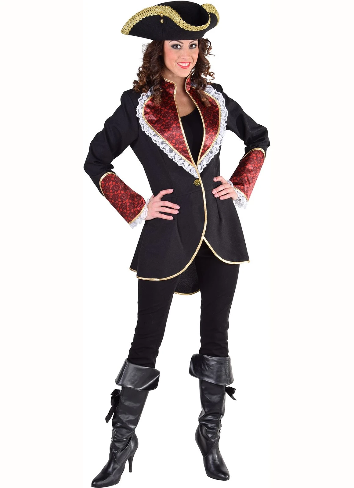 Deze jas Scarlet is zwart van kleur en heeft een zwart met rode rever voorzien van wit kant.