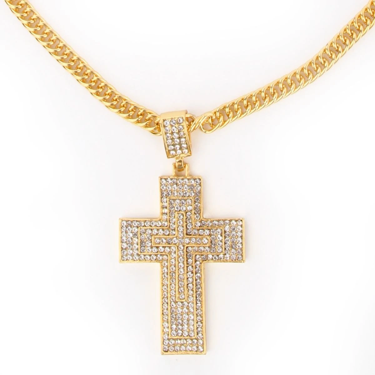 Mooie robuurste gouden ketting met groot kruis eraan. Het kruis is bezet met kunst diamantjes. Perfect voor je gangster/maffia/foute party outfit.