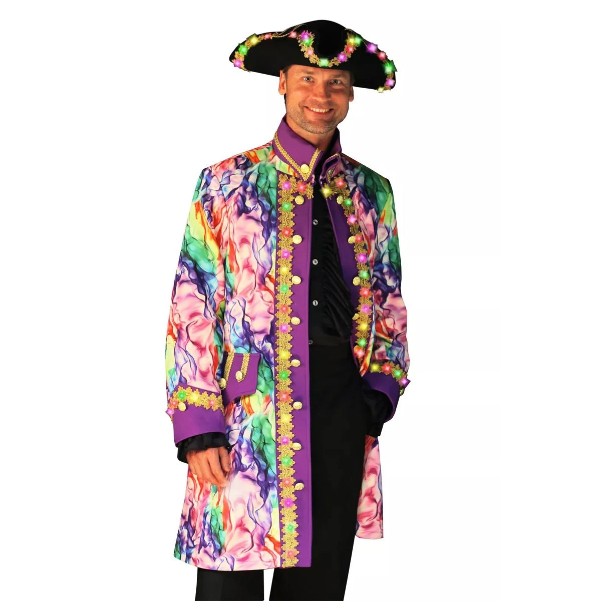 Carnavalsjas Kronos is een exclusieve herenjas met led licht. Het prachtige vlammendesign in het voorpand samen met de paarse, groene en rode kleuren maken deze carnavalsjas een echt plaatje. Geheel gevoerd en van stevige top kwaliteit. De Kronos herenjas is slechts in beperkte mate gemaakt en daardoor zeer uniek. Valt zoals hieronder getoonde maten.
