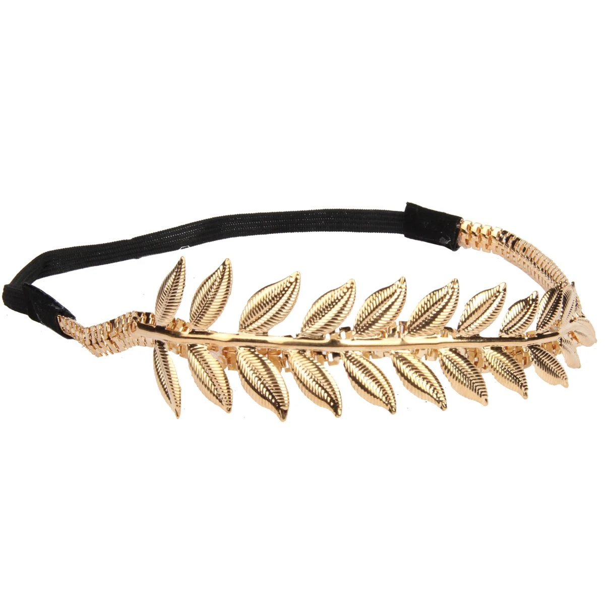 Gouden lauwerkrans van metalen gouden blaadjes op een elastische hoofdband. Geschikt voor Griekse of Romeinse outfit.