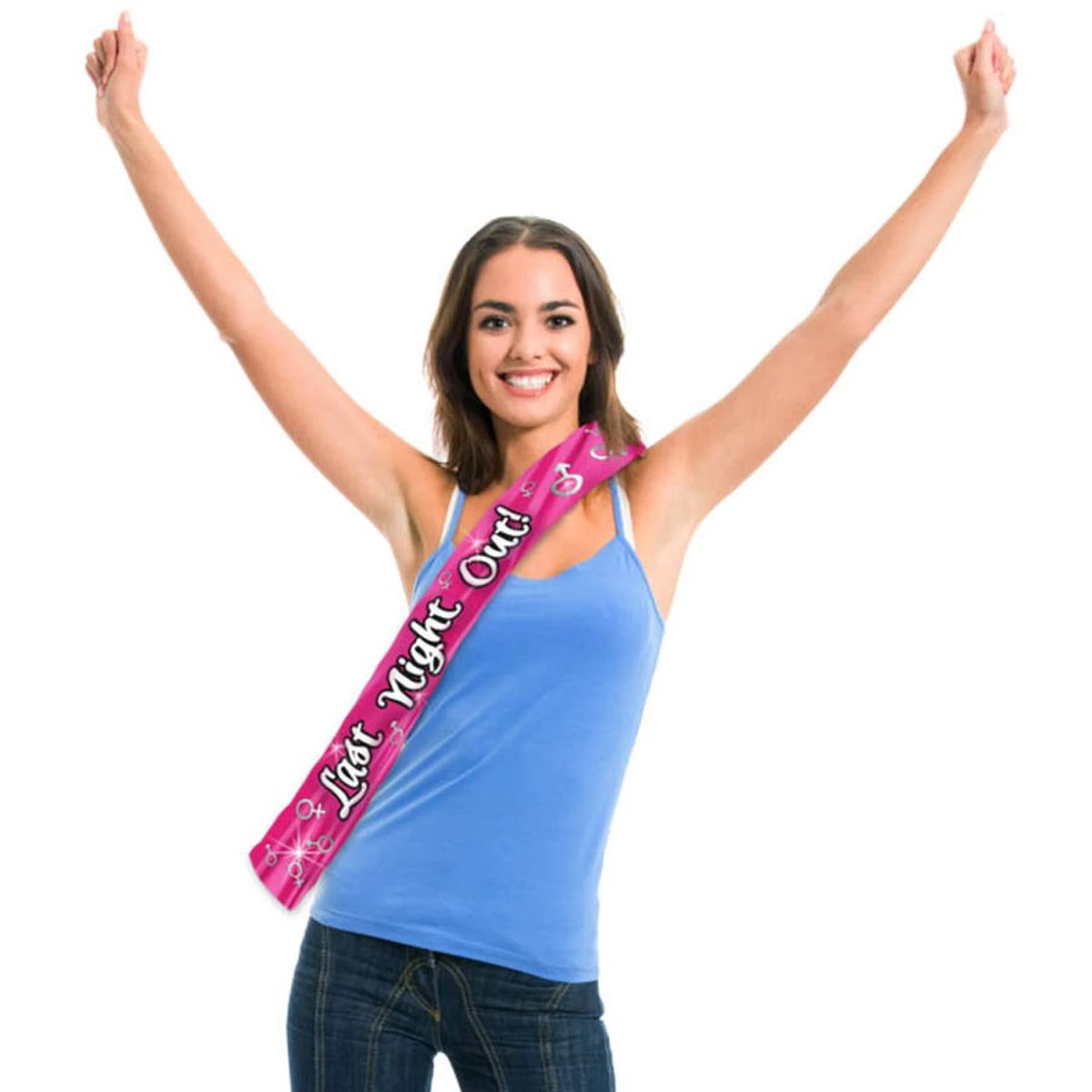 Sprankelende roze sjerp ‘Last night out’ voor de laatste avond als vrijgezel. Deze sjerp heeft LED verlichting zodat de vrijgezel ook ‘s-avonds goed in het licht staat!