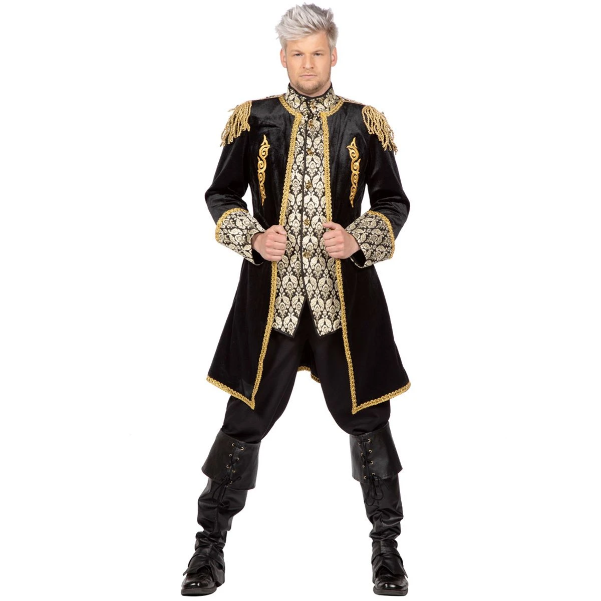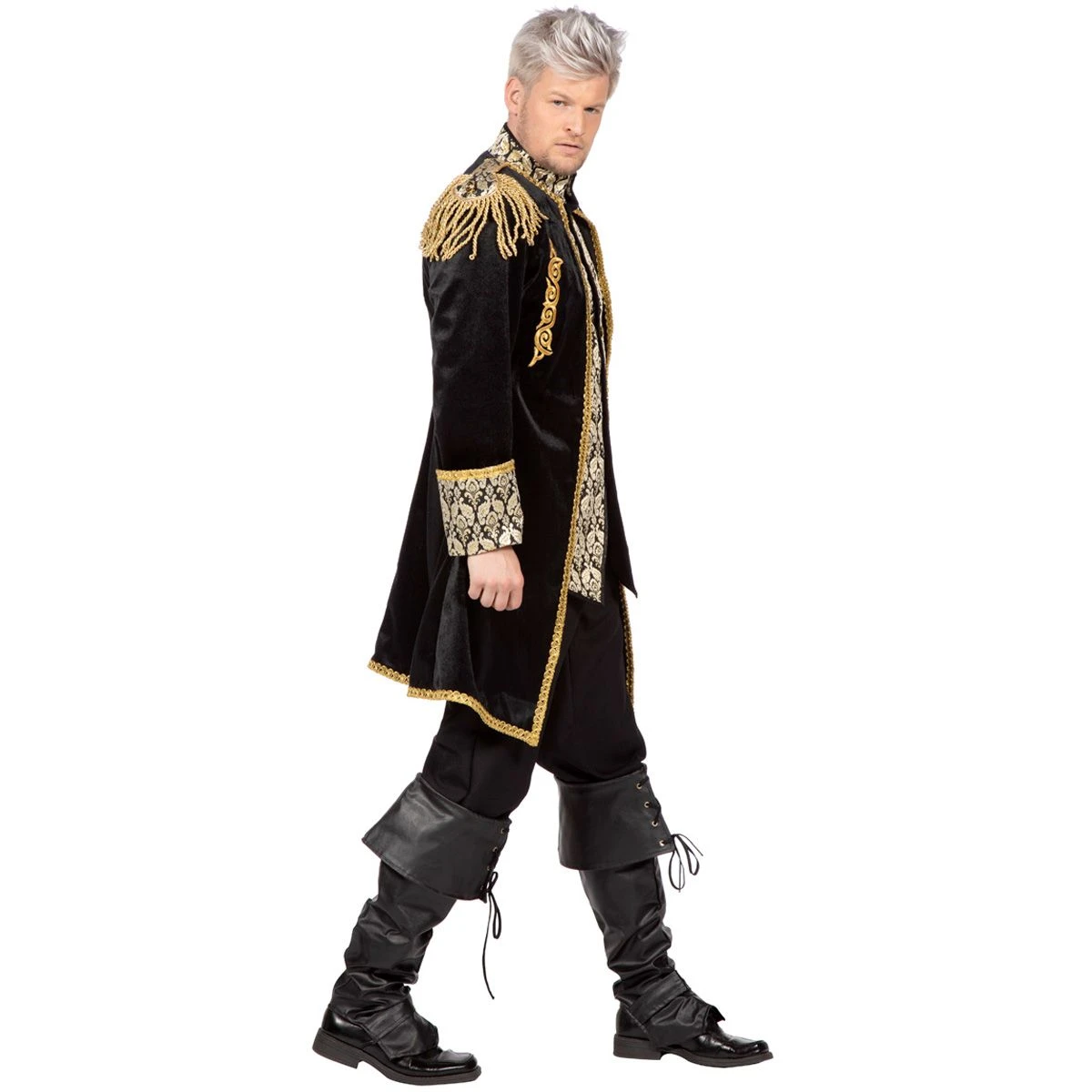 Prachtige, luxe zwarte fluwelen herenjas met een wit kanten jabot. De jas heeft een mooie pasvorm en is schitterend afgewerkt met gouden brokaat band en borduursels. Inclusief zeer mooie epauletten. Een bijpassende herenversie is ook verkrijgbaar.