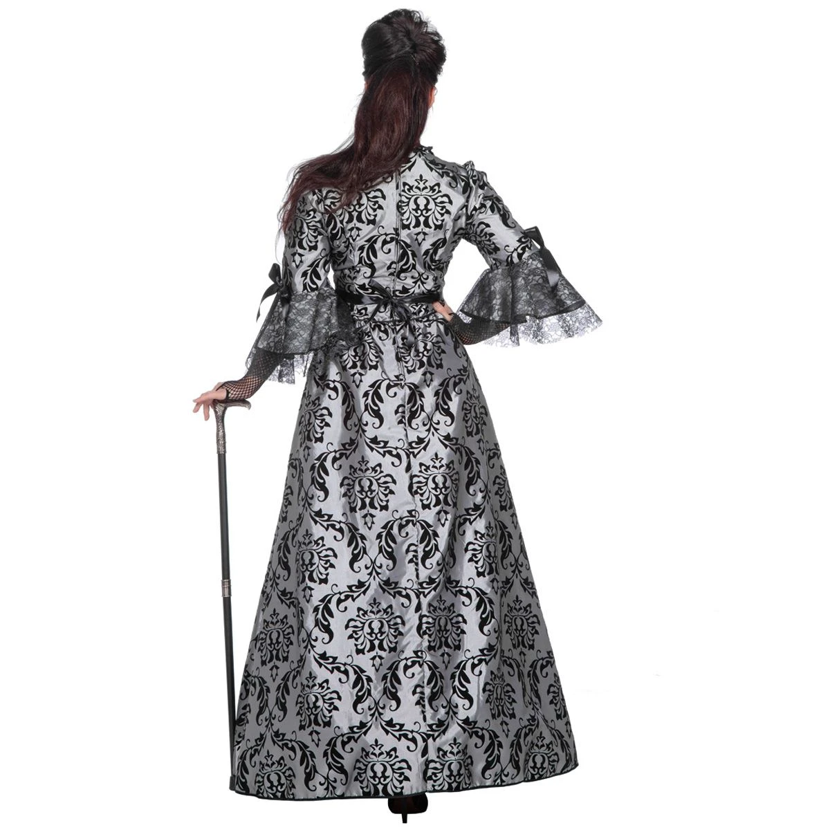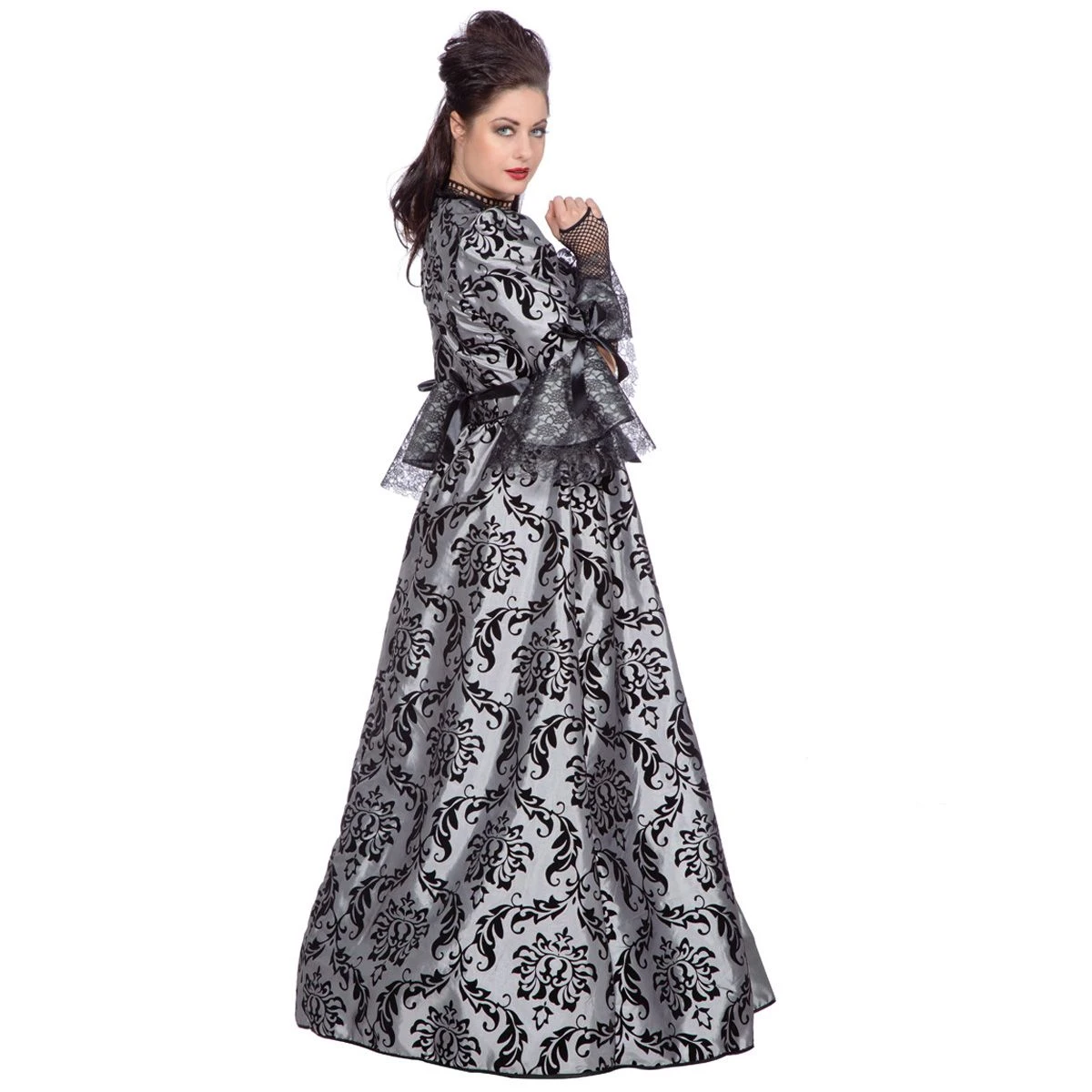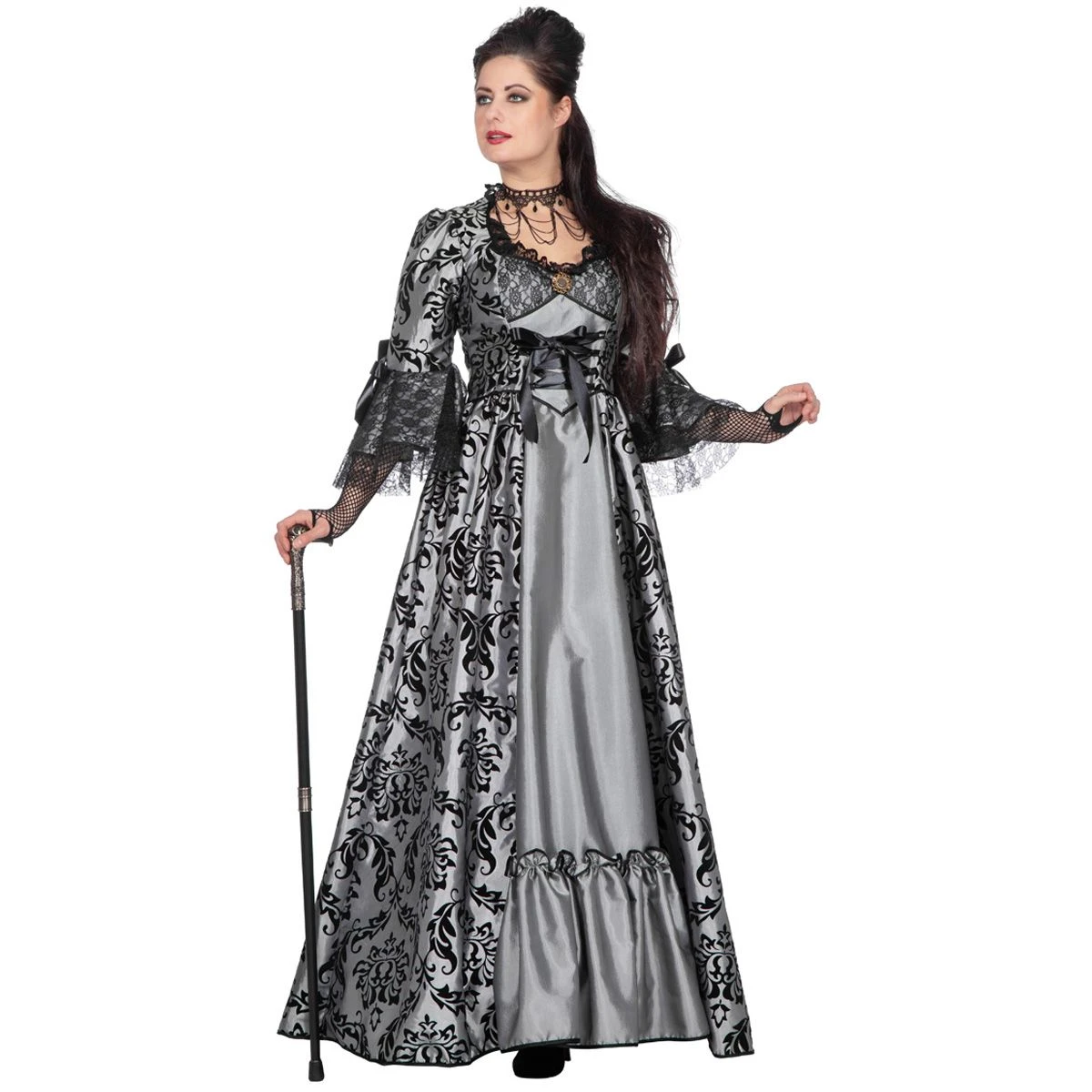 Zeer luxe markiezin jurk. De jurk is grijs met een zwart patroon en heeft kant bij de mouwen. Maak de look af met een van onze kettingen en een hoed. Ook super leuk als koppel kostuum in combinatie met een markies kostuum in dezelfde stijl