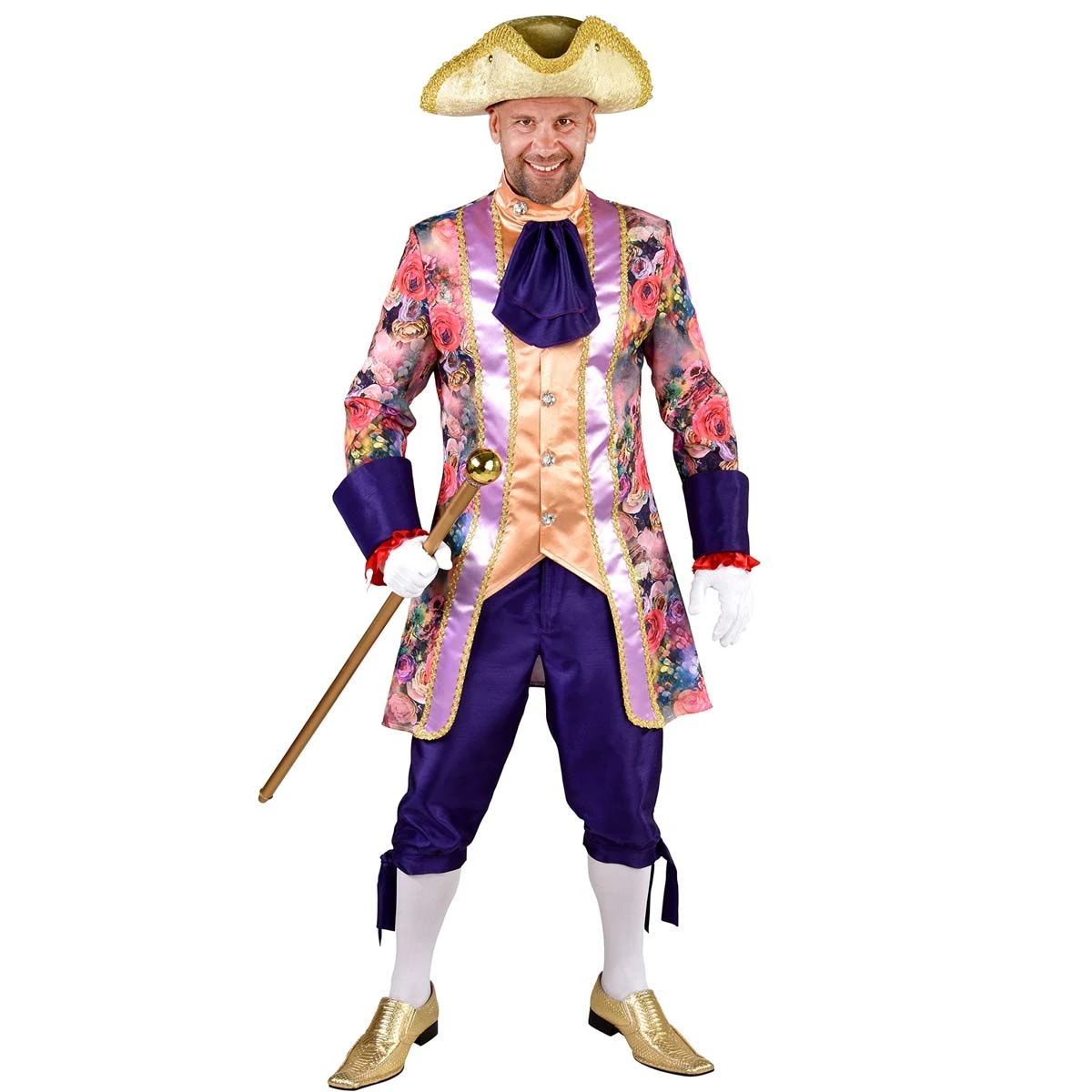 Luxe markies kostuum met rozenprint. Het kostuum bestaat uit een jas met vastgestikt vest en een bijpassende broek.