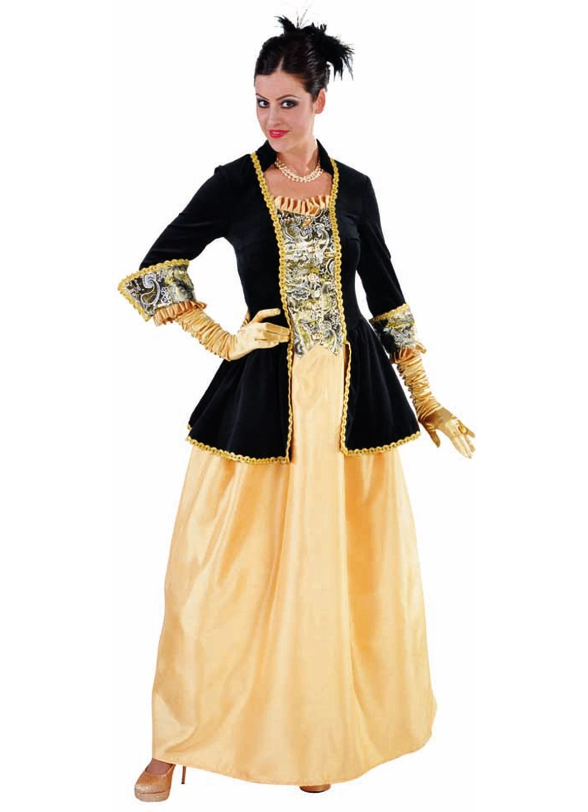 Mooie lange gele markiezin jurk met daaraan vast een zwart jasje.