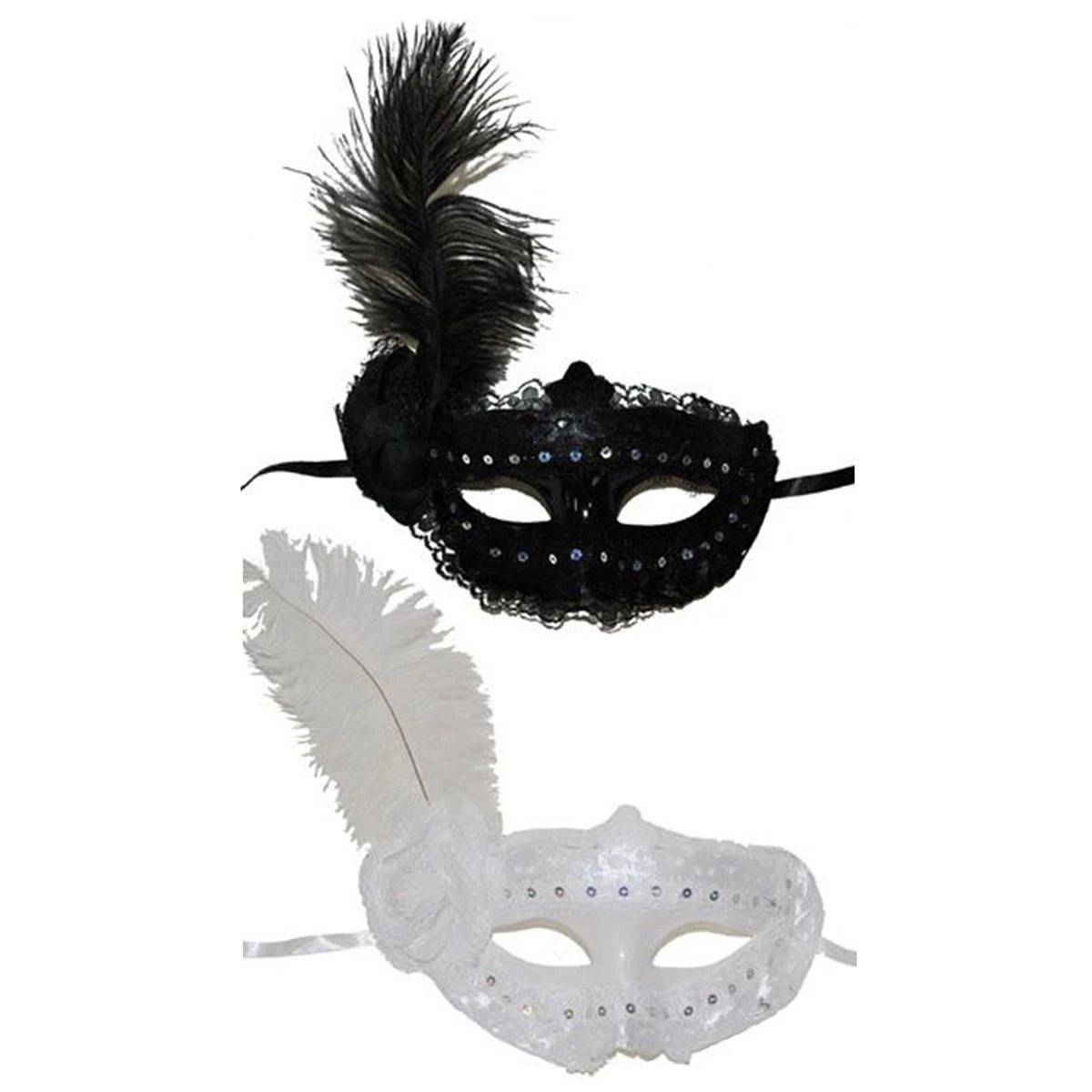 Masker met pailletten, bloem en veer. In wit of zwart.