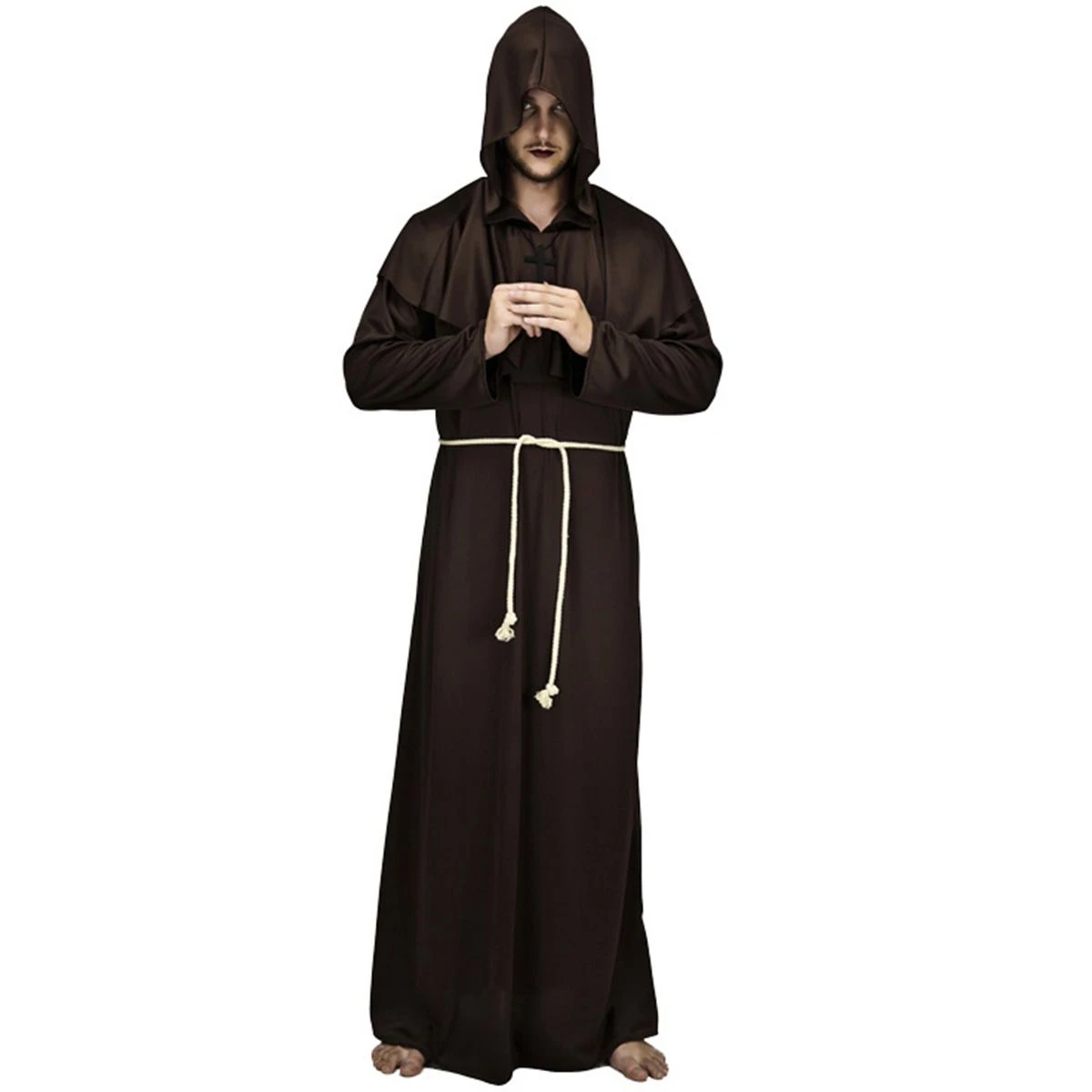 Mooi bruin monnik kostuum met een capouchon, koord en een zwarte ketting met kruis. Combineer deze outfit met wat schmink om er een geweldige halloween outfit van te maken. Ook leuk als koppel outfit samen met een van onze nonnen kostuums. Met dit pak ziet u er hemels uit!