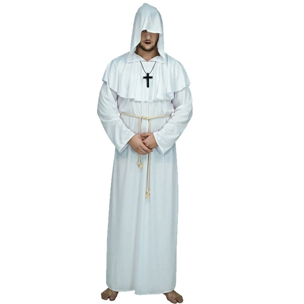 Mooi wit monnik kostuum met een capuchon, koord en een zwarte ketting met kruis. Combineer deze outfit met wat schmink om er een geweldige halloween outfit van te maken. Godzijdank heb je hem optijd gevonden! Ook leuk als koppel outfit samen met een van onze nonnen kostuums.