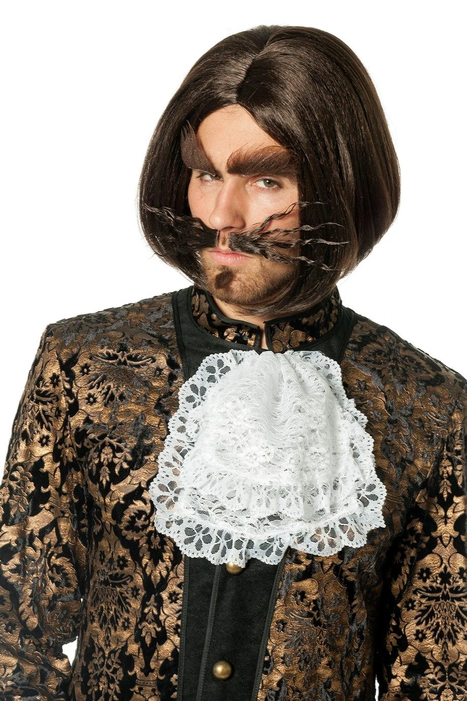 Musketier pruik met snor, sik en wenkbrauwen in het bruin.