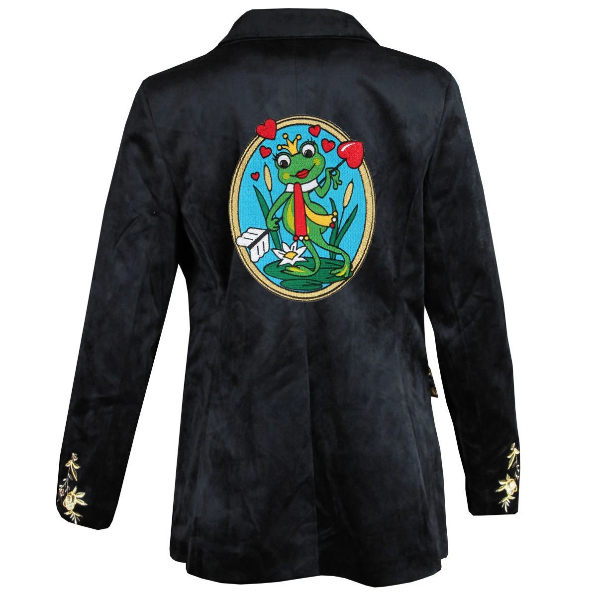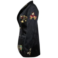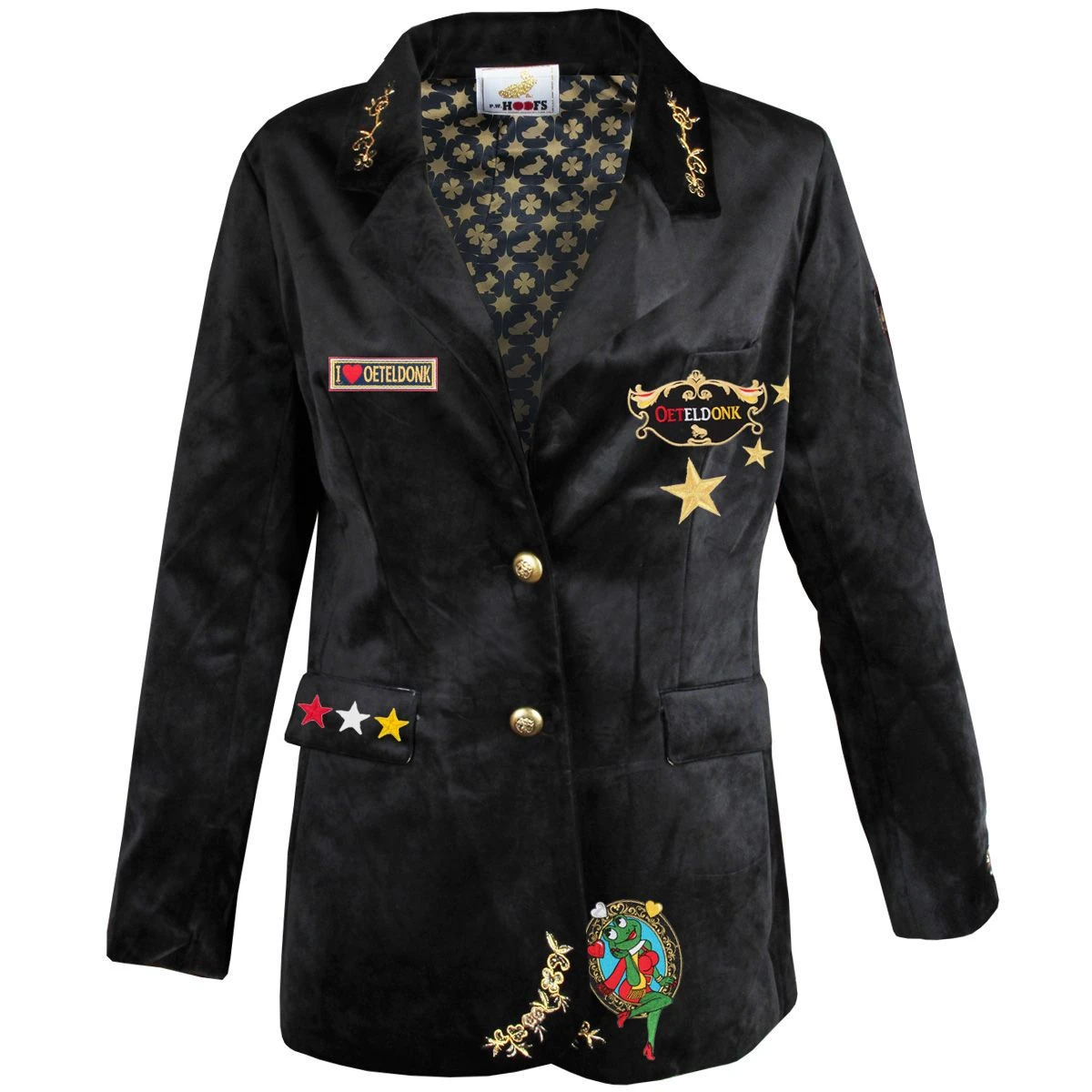 Met deze schitterende, zwarte, fluwelen damesjas heb jij nèt even iets anders. De luxe jas in colbert model heeft prachtige, geborduurde gouden bloemen op de mouwen, kraag en onderzijde. De gouden knopen geven de perfecte finishing touch. De jas is gevoerd, heeft een mooie pasvorm met hoog draagcomfort en is voorzien van 2 steekzakken. De jas is voorgepimpt met prachtige emblemen en een grot rugembleem, dus jas aan en gaan!