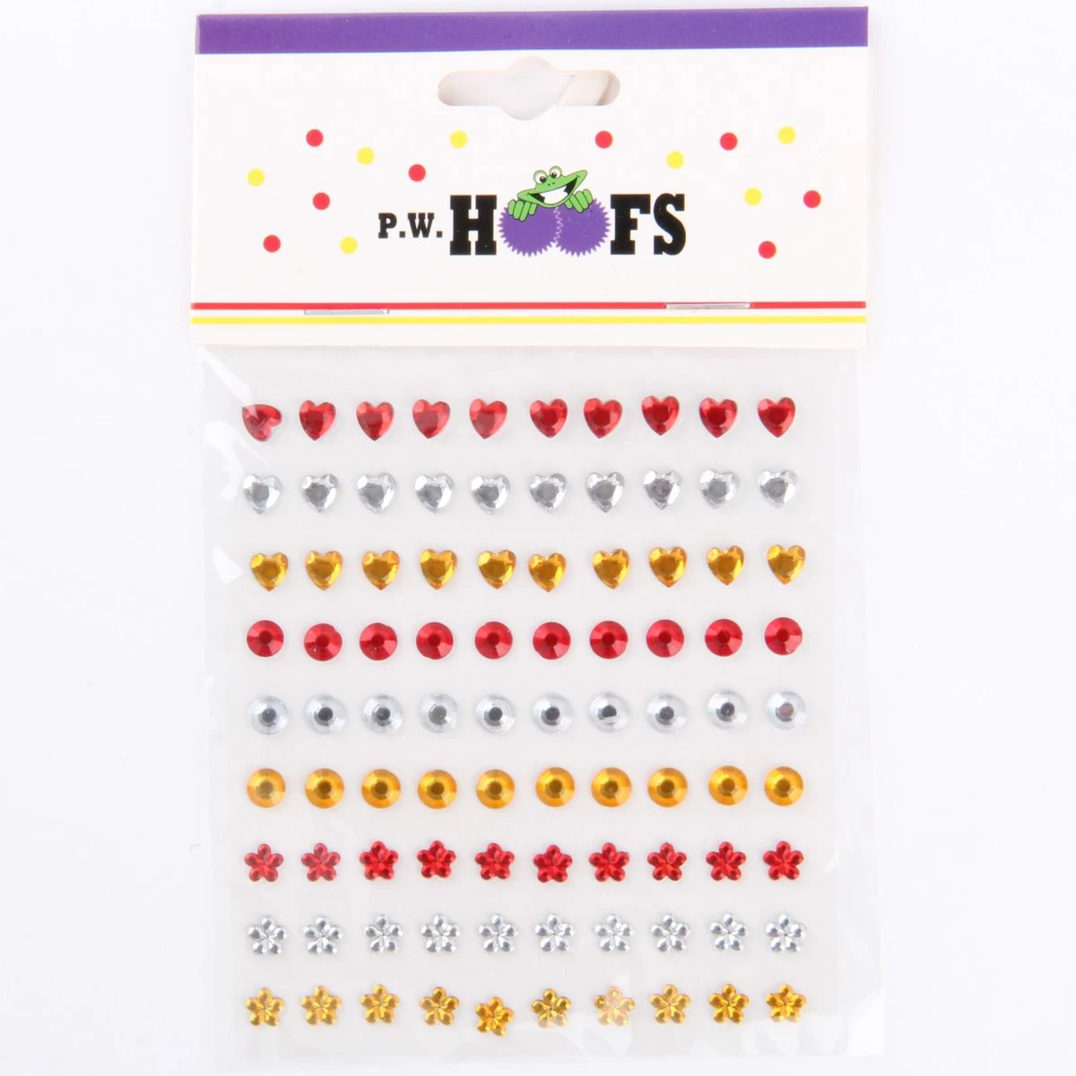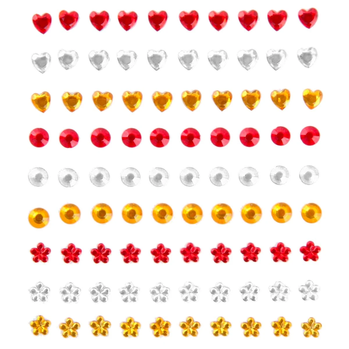 Versier je gezicht met deze rood-wit-gele strass steentjes. De steentjes zitten op een kaartje van 90 stuks en zijn gemakkelijk op je huid te plakken en te verwijderen.