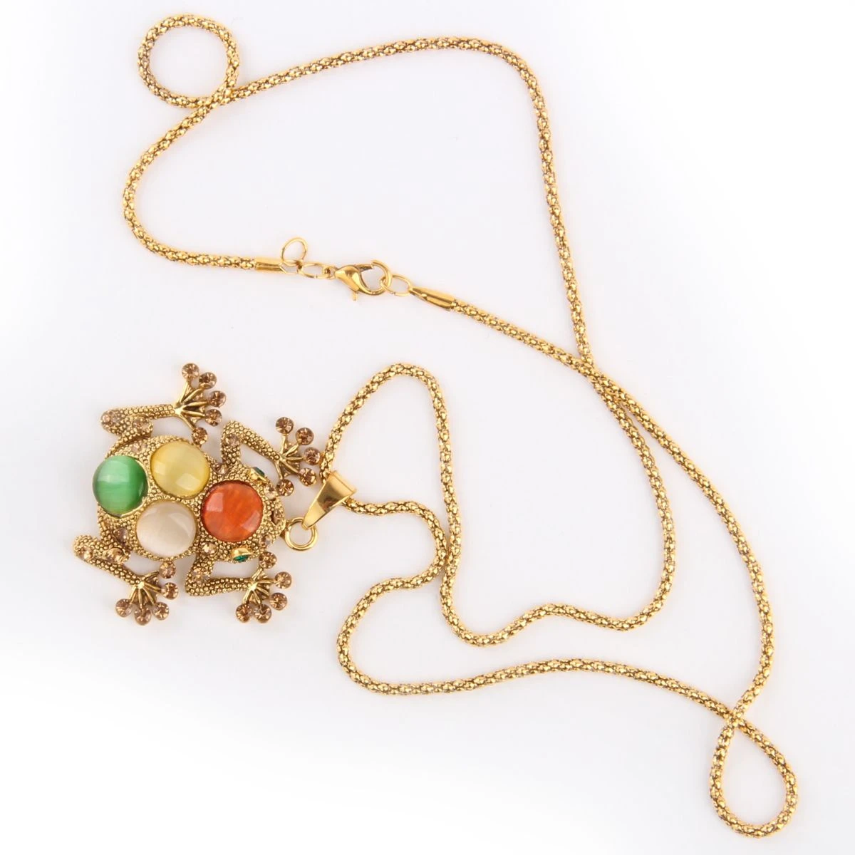 Wat een sierraad voor je hals! Deze gouden kikker, ingezet met rood wit gele steentjes, wil je nooit meer af doen. Een echte blikvanger!