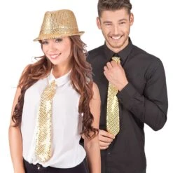 Gouden stropdas met pailletten en elastiek voor om de hals. Leuk voor kerst, oud & nieuw, of een themafeest! Lengte 40 cm.