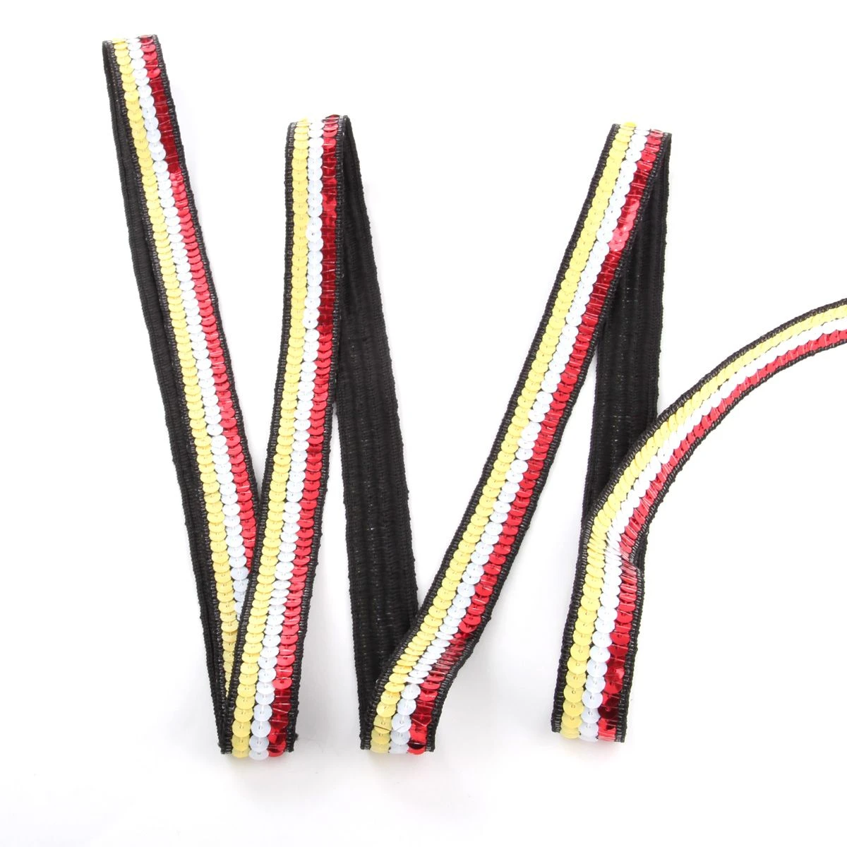 Hele mooie rood-wit-gele Oeteldonks paillettenband. Het band is 2 cm breed. Voor het versieren van je kiel, jasje, hoedje, tas of ter decoratie.