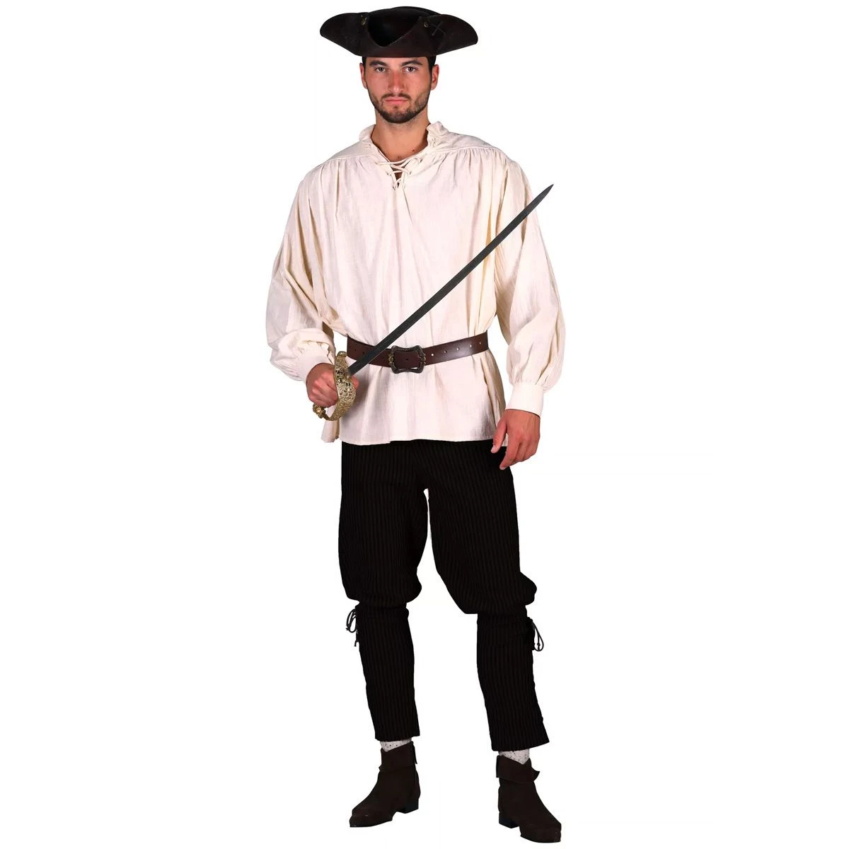 Zeer mooie zwarte broek. Deze broek heeft een veter aan de onderzijde waardoor de broek los zit bij de bovenbenen en strak bij de kuiten. Perfect voor middeleeuwse of piratenoutfits. Combineer ‘m met een van onze piratenshirts en een zwaard!