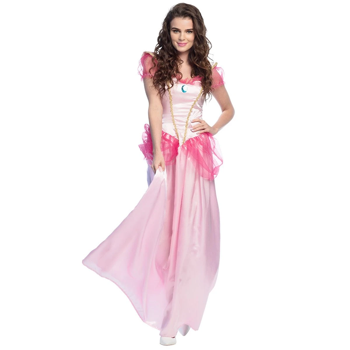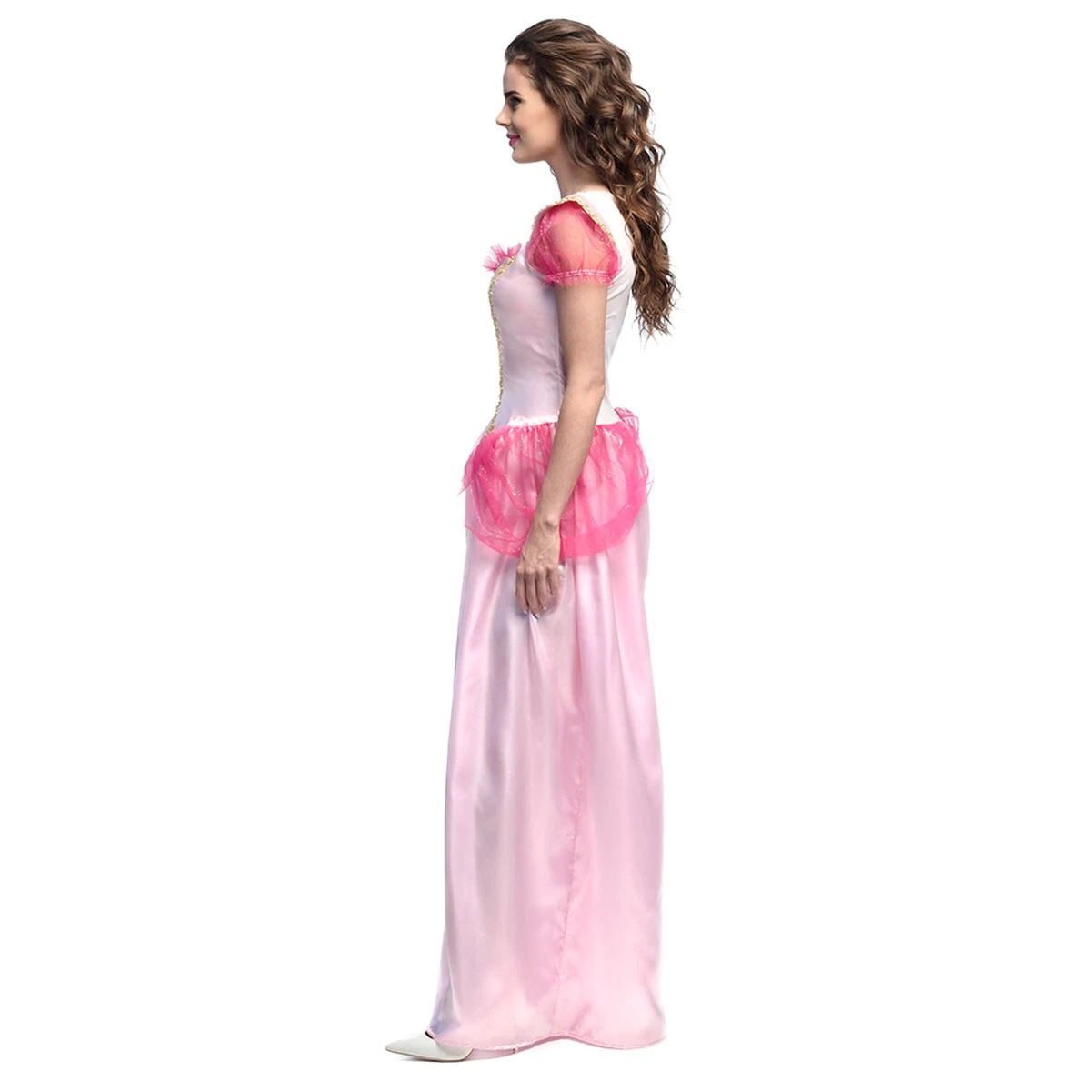 Lange roze prinsessenjurk met goudband, een edelsteen en roze ruches. Combineer deze jurk met een kroon en jij bent de prinses op het bal!
