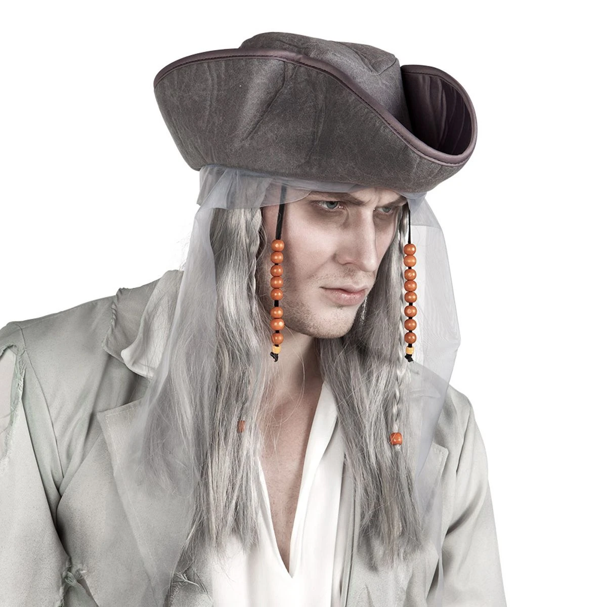 Ghosty piratenpruik grijs, met kraaltjes en hoed. Perfect voor je piratenoutfit.