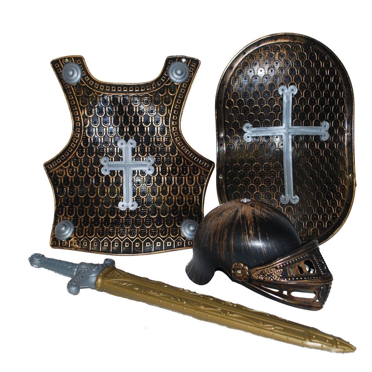 4-delige ridderset. Bestaat uit: harnas, helm, zwaard en schild.
