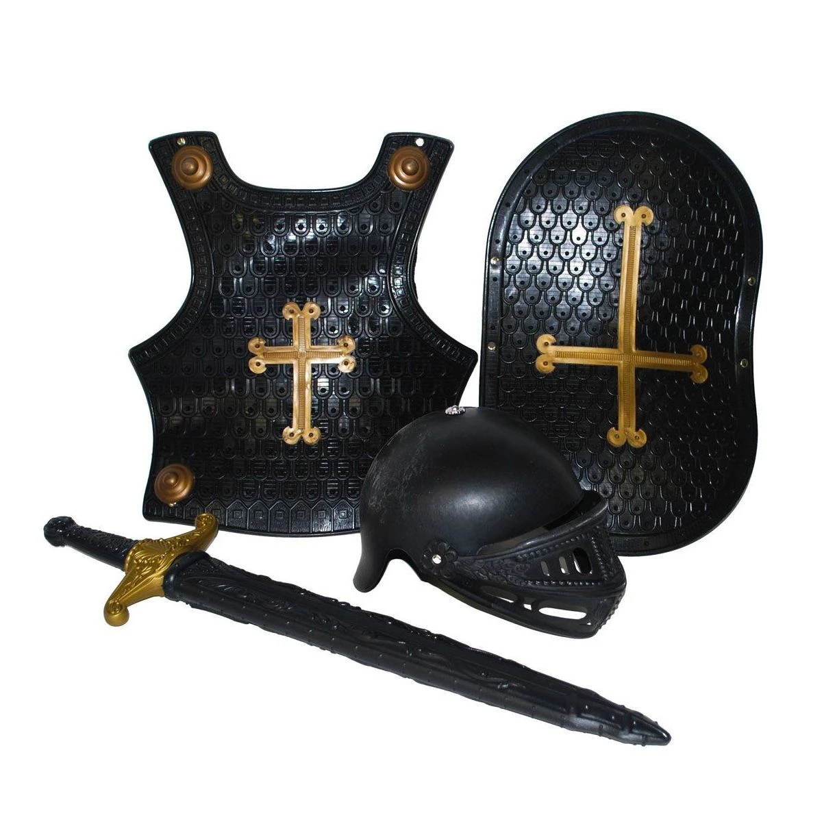 4-delige ridderset. Bestaat uit: harnas, helm, zwaard en schild.