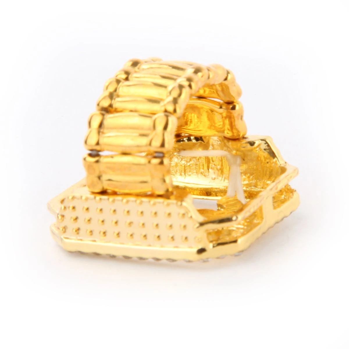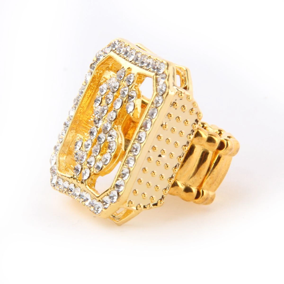 Gouden dollar ring met diamantjes. Leuk voor je gangster/maffia/fout party outfit. One-size past altijd.
