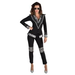 Dit rock/space kostuum bestaat uit een broek en een jasje met rits met zilveren accenten.