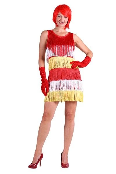 Ruby jurk met franjes in het rood-wit-geel. Deze prachtige damesjurk is erg leuk te dragen met carnaval. Met deze jurk in Oeteldonkse kleuren ben je volledig in stijl gekleed.