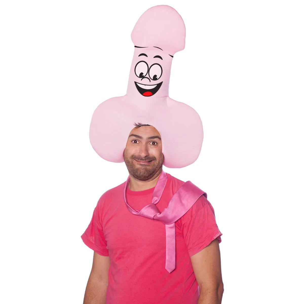 Roze piemel pruik van foam voor een vrijgezellenfeest.