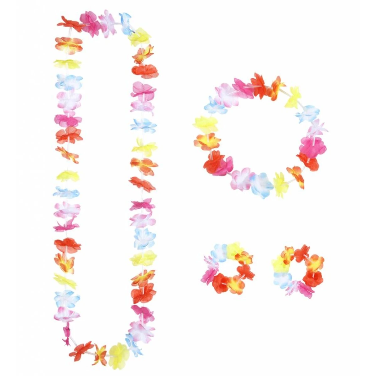 Hawaii set meerkleurig wordt geleverd met de volgende artikelen: lei, kroon, 2 armbanden