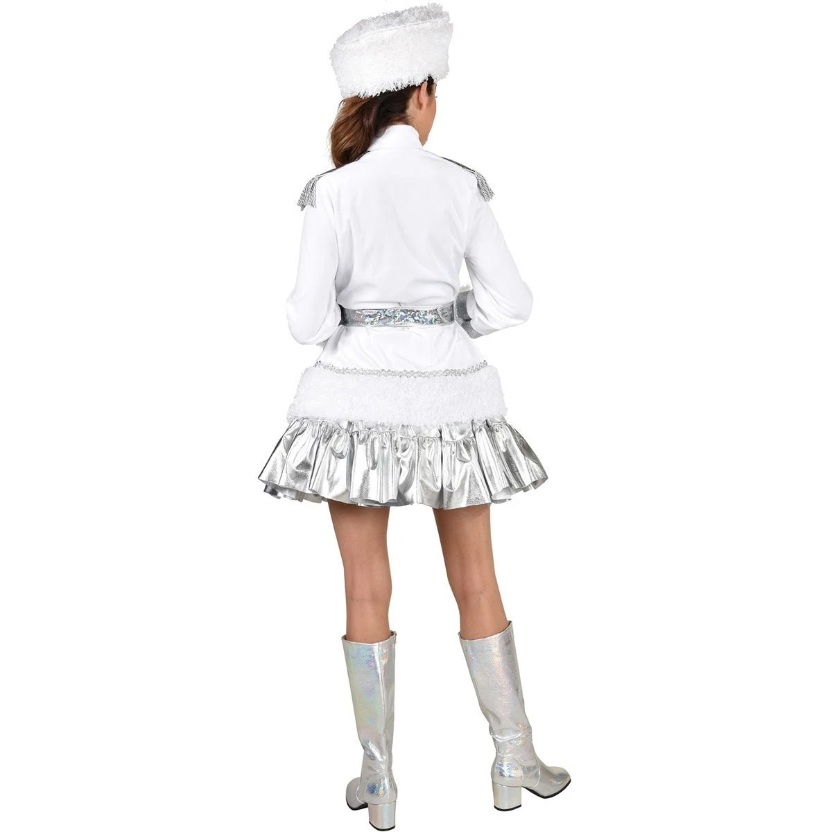 Erg mooie witte ijs mantel voor dames. Deze jas is versierd met zilveren epauletten, brokaatband en een glinsterende riem. Een perfect winters kostuum. Combineer de mantel met een zilveren petticoat en zilveren laarzen om je outfit compleet te maken.