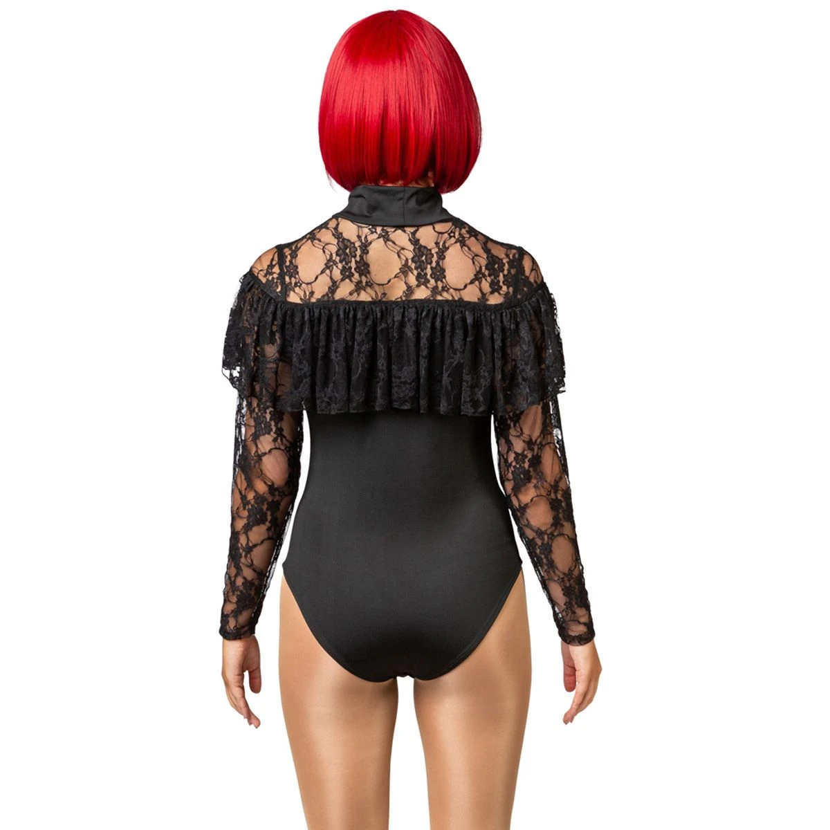 Mooie zwarte body met kanten cape, opstaande kraag en lange mouwen. Een hele mooie body om onder een jurk of jas te dragen.